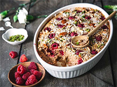 ZubereitungDen Seeberger Bio-Himbeer-Porridge zusammen mit dem Backpulver, einer Prise Zimt und einer Prise Salz in einer Schüssel vermischen. Die Mandelmilch mit dem Honig erwärmen. Warm über den Porridge gießen und ca. 5 Minuten ziehen lassen. Dann das Ei unterrühren und zum Schluss die Himbeeren vorsichtig unter den Porridge heben, damit sie nicht zerquetschen.Eine Auflaufform (ca. 18 cm) mit Kokosöl einfetten. Den Porridge in die Auflaufform füllen. Mit Kokosflocken, gehackten Mandeln und Pistazien bestreuen und im vorgeheizten Ofen ca. 30 Minuten backen, bis er goldbraun wird.