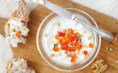 8 Stück Seeberger Walnüsse1 rote Spitzpaprika oder ½ rote Paprikaschote2 Zweige Thymian150 g Frischkäse½ TL Schale einer unbehandelten ZitroneMeersalz, Pfeffer frisch gemahlen