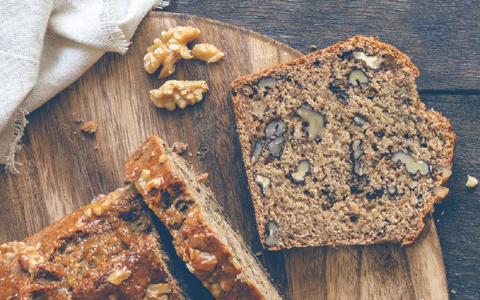 3 Bananen80 ml Kokosöl60 g Joghurt60 g Ahornsirup2 Eier1 TL Vanillemark1 TL Natron150 g gemahlene Haferflocken100 g Mehl½ TL Zimt120 g Seeberger Walnüsse