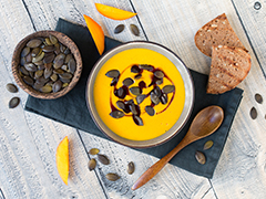 Zutaten 900 g Hokkaido-Kürbis1 Zwiebel2 Äpfel1 cm Ingwerwurzel3 EL Rapsöl350 ml Gemüsebrühe1 Dose Kokosmilch1 Prise Salz und Pfeffer4 EL Seeberger schalenlose Kürbiskerne2 EL Kürbiskernöl