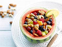 35 g Seeberger Haselnusskerne35 g Seeberger Mandeln35 g Seeberger Cashewkerne1 EL Seeberger Blaumohn1 halbe Wassermelone1/2 Birne1/2 Apfel1 Kiwi1/2 Orange120 große rote Trauben30 g Himbeeren30 g Blaubeeren60 g Erdbeeren30 g Brombeeren1 Zitrone1 EL Honig