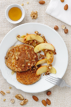 Äpfel putzen, waschen und in Spalten schneiden. Nüsse grob hacken. Butter in einer Pfanne erhitzen, Äpfel kurz andünsten, Nüsse zugeben und mit 1 EL Honig karamellisieren lassen. Äpfel mit dem restlichen Honig zu den Pancakes servieren.