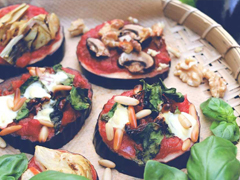 Den Backofen auf 180 Grad Umluft vorheizen. Auberginen in Scheiben schneiden und die Scheiben auf ein mit Backpapier belegtes Backblech legen. Tomaten aus der Dose zusammen mit gehackten Zwiebeln, gepresster Knoblauchzehe sowie italienische Kräuter, Salz und Pfeffer vermengen. Den Tomatensugo mit einem Esslöffel auf die Auberginenscheiben verteilen. Nun die kleinen Pizzen mit Champignonscheiben, Artischockenviertel und Basilikumblättern belegen. Je einen Klecks Sojajoghurt oder Mozzarella darauf geben und Walnusskerne, sowie Pinienkerne darauflegen. Im Ofen ca. 15 min durchbacken und heiß servieren.