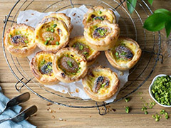 Zubereitung:Den Blätterteig ausrollen und 12 Kreise mit je 10 cm Durchmesser ausstechen. Ein Muffinblech mit Butter einfetten und die Blätterteigkreise hineindrücken. Kaltstellen.