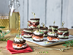Zutaten für die Pumpernickel mit Zitronen-Walnuss-Frischkäse und geräuchertem Lachs:12 runde Party-Pumpernickel150 g Frischkäse500 g JoghurtSchale von einer Bio-Zitrone3 Stängel Petersilie40 g Seeberger Walnusskerne100 g RäucherlachsSalz und Pfeffer