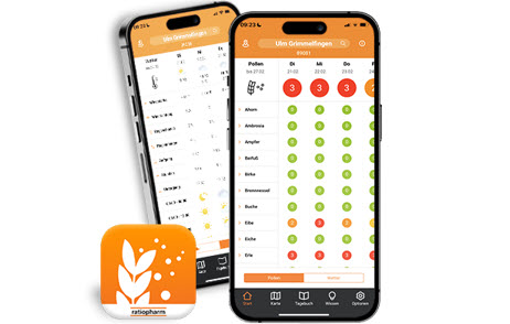 Allergie ratiopharm Pollen-Radar Unsere ratiopharm Pollen-Radar App bietet Vorhersagen und Informationen für 40 Pollen-Arten. Neben der standortspezifischen Ausgabe der Pollenbelastung bietet unsere App zudem ein persönliches Allergietagebuch, eine 7-Tage-Wettervorhersage sowie wertvolle Tipps und Informationen rund um das Thema der Pollenallergie. Mehr zur ratiopharm Pollen-Radar-App