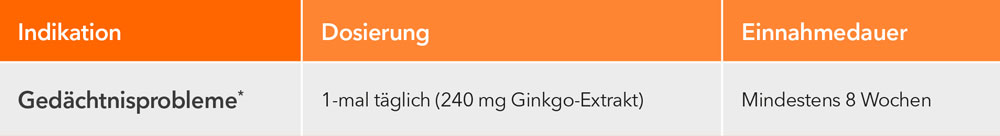 3.2 Falls vom Arzt nicht anders verordnet, ist die übliche Dosis: Erwachsene ab 18 Jahren sollten 1-mal täglich 1 Filmtablette einnehmen (entsprechend 240 mg Ginkgo-Extrakt pro Tag).