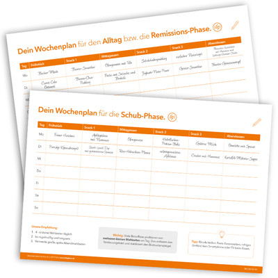 Machen den Einkauf und die Ernährungsumstellung leicher: Wochenpläne zum Selbstausfüllen mit zwei beispielhaften Vorlagen für Schub und Remission.
