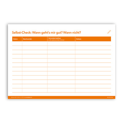 Wann geht’s mir gut, wann nicht? Mit dem Selbst-Check können Sie ergänzend zum Ernährungstagebuch fördernde und belastende Situationen festhalten.