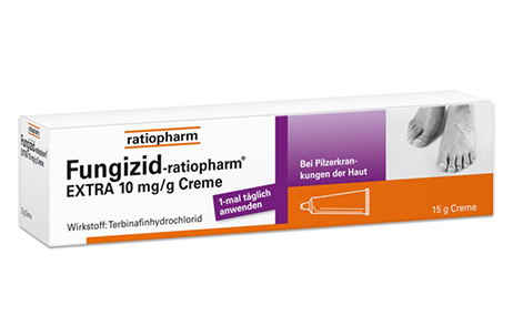 Bei Fungizid-ratiopharm® EXTRA mit dem Wirkstoff Terbinafinhydrochlorid reicht bereits eine Anwendung pro Tag aus – bei einer Behandlungsdauer von einer Woche.
