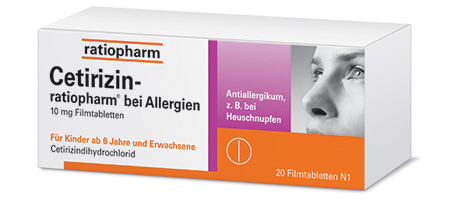 Niesreiz, laufende Nase und gerötete, juckende Augen? Antiallergische Medikamente wie z. B. Cetirizin-ratiopharm® Filmtabletten lindern allergiebedingte Nasen- und Augensymptome bei Erwachsenen und Kindern ab 6 Jahren. Zudem wirkt das Antihistaminikum Cetirizin-ratiopharm® auch entzündungshemmend.