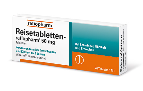 Reisetabletten-ratiopharm® Wirkstoff: Dimenhydrinat. Anwendungsgebiete: Vorbeugung und Behandlung von Reisekrankheit, Schwindel, Übelkeit und Erbrechen (nicht bei Chemotherapie). Warnhinweis: AM enth. Lactose u. weniger als 1 mmol (23 mg) Natrium pro Tbl., d. h. es ist nahezu „natriumfrei“. Apothekenpflichtig. Zu Risiken und Nebenwirkungen lesen Sie die Packungsbeilage und fragen Sie Ihre Ärztin, Ihren Arzt oder in Ihrer Apotheke. 12/20.