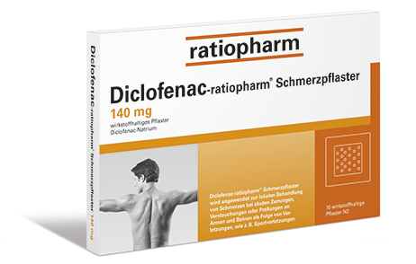 Diclofenac-ratiopharm® Schmerzpflaster Wirkstoff: Diclofenac-Natrium. Anwendungsgebiete: Bei Jugendlichen ab 16 Jahren u. Erwachsenen zur lokalen, symptomatischen Kurzzeitbehandlung von Schmerzen bei akuten Zerrungen, Verstauchungen oder Prellungen an Armen und Beinen als Folge von Verletzungen, wie z. B. Sportverletzungen. Bei Beschwerden, die länger als 3 Tage anhalten, sollte ein Arzt aufgesucht werden. Warnhinweis: Schmerzpflaster enth. Propylenglycol u. Butylhydroxytoluol! Apothekenpflichtig. Zu Risiken und Nebenwirkungen lesen Sie die Packungsbeilage und fragen Sie Ihre Ärztin, Ihren Arzt oder in Ihrer Apotheke. 7/25.