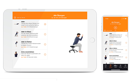 In der App können Sie zwischen 24 verschiedenen Übungen wählen, um Ihren Rücken zu stärken. Für jede Übung ist angegeben, welchen spezifischen Bereich sie trainiert oder dehnt, wie viele Wiederholungen ausgeführt werden sollten und wie viel Zeit dafür etwa einzuplanen ist.