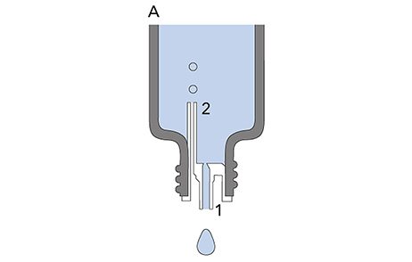 Wichtig: Tropffläschchen müssen gepflegt werden! Achten Sie bitte darauf, dass keine Flüssigkeitsreste an Tropfeinsatz und Flaschengewinde zurückbleiben und schrauben Sie das Fläschchen sorgfältig und fest zu! Andernfalls kann es passieren, dass die zurückgebliebene Flüssigkeit antrocknet und Wirkstoffkristalle das Tropfröhrchen (1) oder das Belüftungsröhrchen (2) verkleben. Dann hilft nur noch, den Einsatz vorsichtig heraus zu hebeln und ihn unter fließendem Wasser zu spülen. Achten Sie darauf, dass der Tropfeinsatz völlig getrocknet ist, bevor Sie sie wieder in den Flaschenhals eindrücken.