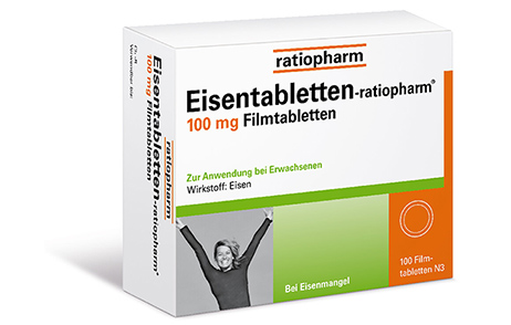 Bei einem Eisenmangel reicht eine eisenhaltige Ernährung nicht aus, um das Defizit in den Griff zu bekommen. Damit der Eisenhaushalt rasch wiederhergestellt ist, stehen in der Apotheke hochdosierte Präparate wie Eisentabletten-ratiopharm® zur Verfügung. Eisentabletten-ratiopharm® liefern 100 mg elementares Eisen und sind speziell zur Therapie eines Eisenmangels geeignet. Um diesen zu beheben, empfiehlt sich grundsätzlich eine Behandlungsdauer von mindestens 8 Wochen. Nach Normalisierung der Blutwerte sollten die Tabletten weitere 6-8 Wochen eingenommen werden, um den Eisen-Vorrat aufzufüllen.