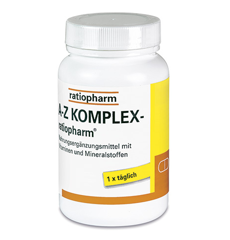 A-Z KOMPLEX-ratiopharm® ist die Rundumversorgung, mit der Sie Ihren täglichen Bedarf an Mikronährstoffen schnell und praktisch decken können. Es versorgt den Körper mit allen Vitaminen und darüber hinaus mit wichtigen Mineralstoffen und Spurenelementen wie beispielweise Calcium, Magnesium, Eisen und Zink.Die Einnahme von einer Tablette täglich ist ausreichend. Die Tabletten sind frei von Gluten, Laktose, Gelatine und Zucker.