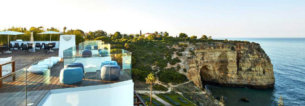Ockerfarbene Sandfelsen die in der Sonne glänzen, geheimnisvolle Grotten, grüne Pinien, windschiefe Mastixsträucher und der schimmernde Atlantik. Das ist der Blick, den Gäste vom – anders kann man es nicht sagen – traumhaft gelegenen 5-Sterne-Hotel Tivoli Carvoeiro genießen. Denn es thront über der Bucht Praia Vale Covo direkt an der imposanten Steilküste der Felsen-Algarve und allein dieser Blick ist schon ein Hochgenuss. Das Interieur des 2017 neu renovierten Hotels kommt sommerlich-leicht daher und referiert mit seinem in Blau, Weiß und Gold gehaltenen Design und vielen Deko-Elementen aus heimischer Korkeiche und Keramik auf die Umgebung sowie das benachbarte Fischerdorf Carvoeiro.