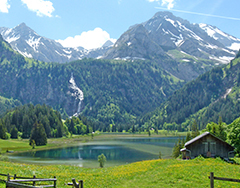 Bevor wir dann zu unserer Wanderung zum Lauenensee aufbrechen, machen wir einen kurzen Halt an der Molkerei in Gstaad um den Fondue-Rucksack abzuholen. Hier ist alles drin was zu einem echten „Schweizer Käsefondue“ gehört, inklusive Caquelon (das ist der Topf in dem der Käse geschmolzen wird), Rechaud, Teller und Gabeln. Erwartungsvoll geht´s endlich los. Mit reichlich Sonnenschein starten wir in Richtung Lauenensee, vorbei an blühenden Wiesen die einen tollen Duft verströmen und einfach gute Laune machen. Langsam aber stetig, immer bergauf, bis wir dann den See erreichen. Ein toller Ausblick erwartet uns.